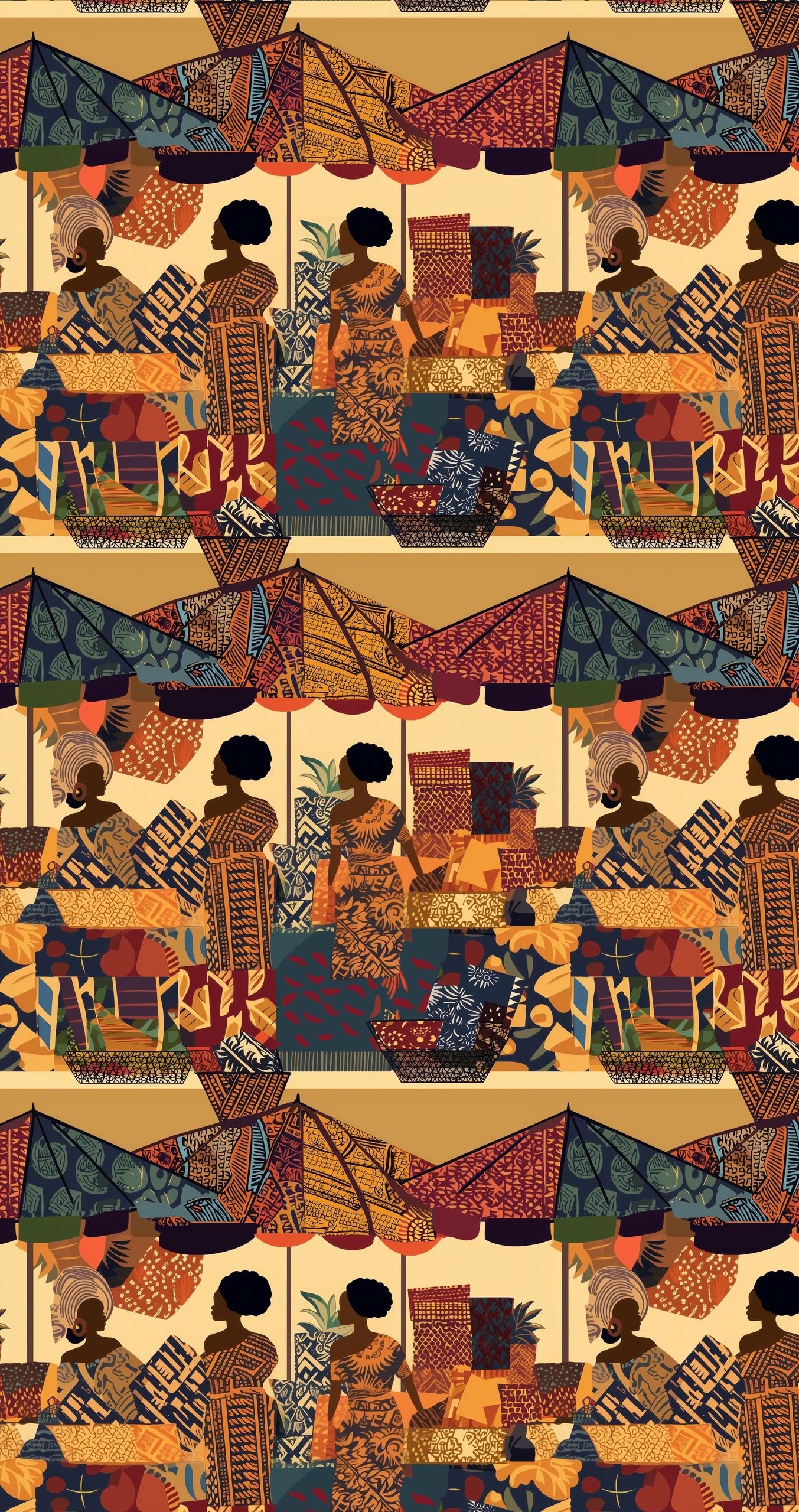 Bring vibrant storytelling and cultural charm to your next project with our African Market Women seamless cotton fabric. This richly detailed print captures a dynamic marketplace scene, where elegant African women dressed in traditional attire are surrounded by vivid bolts of fabric, baskets of fruit, and boldly patterned umbrellas. Perfectly seamless for continuous printing, this fabric is ideal for creating statement garments, home decor, tote bags, quilts, and accessories. The warm palette of mustard, indigo, rust, and navy evokes a sense of tradition while celebrating modern Afrocentric style.