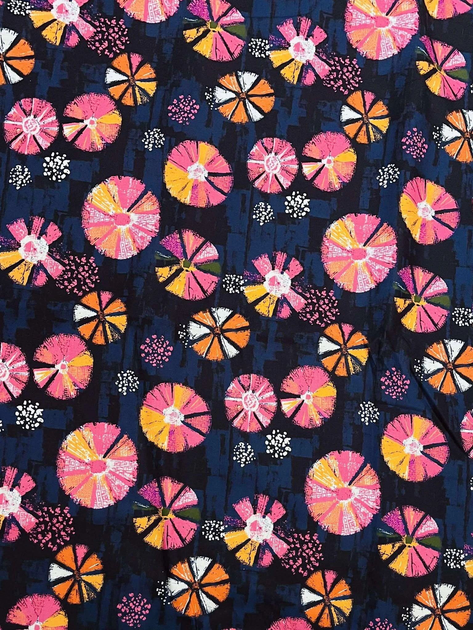 Modern abstract circles in pink, orange, white on navy