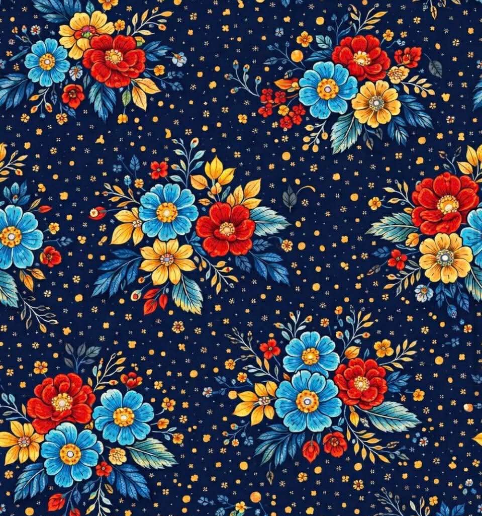 This navy floral quilting fabric showcases vibrant blooms across a deep navy background, creating a bold and dynamic design.
