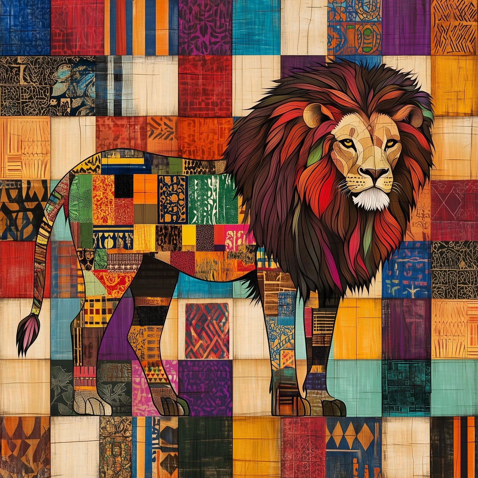 The king of the jungle is reimagined with vibrant Afrocentric patchwork textures. The rich, colorful mane and intricate block designs blend tradition and bold artistry in one unforgettable piece. Details: Size: 45 by 45 inches Multi-colored patchwork style Quilting-weight cotton Ideal for wall hangings and quilts