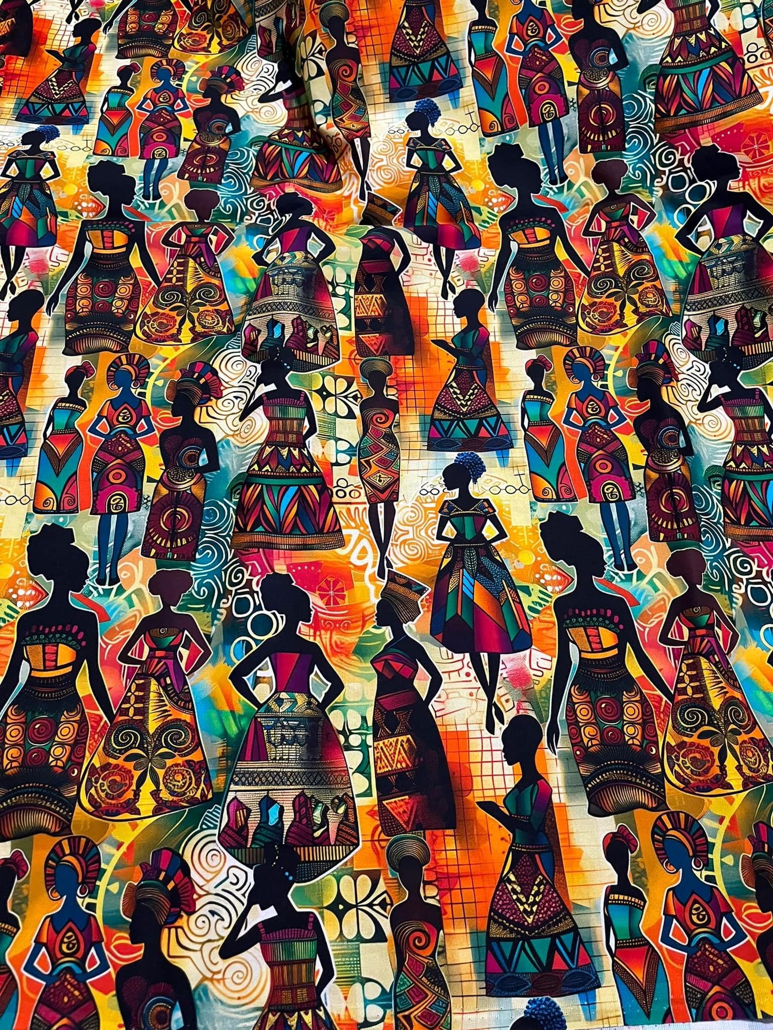 Elegant silhouettes of African women in richly patterned gowns. Each figure embodies strength and heritage, with vibrant geometric motifs. Cotton, sold by the yard. Colors: Orange, teal, red, yellow, green, purple, black. Uses: Dresses, skirts, accessories, quilts, wall hangings.