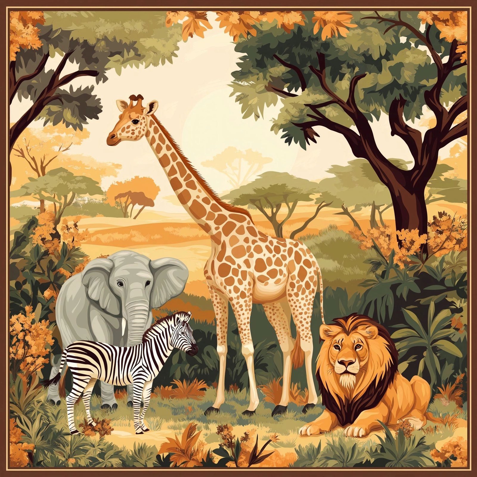 Bring the wild to life with this beautifully illustrated safari scene, featuring a lion, giraffe, elephant, zebra, and tiger in their natural setting. Rendered in warm golden tones, it feels like stepping into the heart of the savanna. Details: Size: 45 by 45 inches Richly detailed, realistic style Quilting-weight cotton Great as a quilt centerpiece or wall décor
