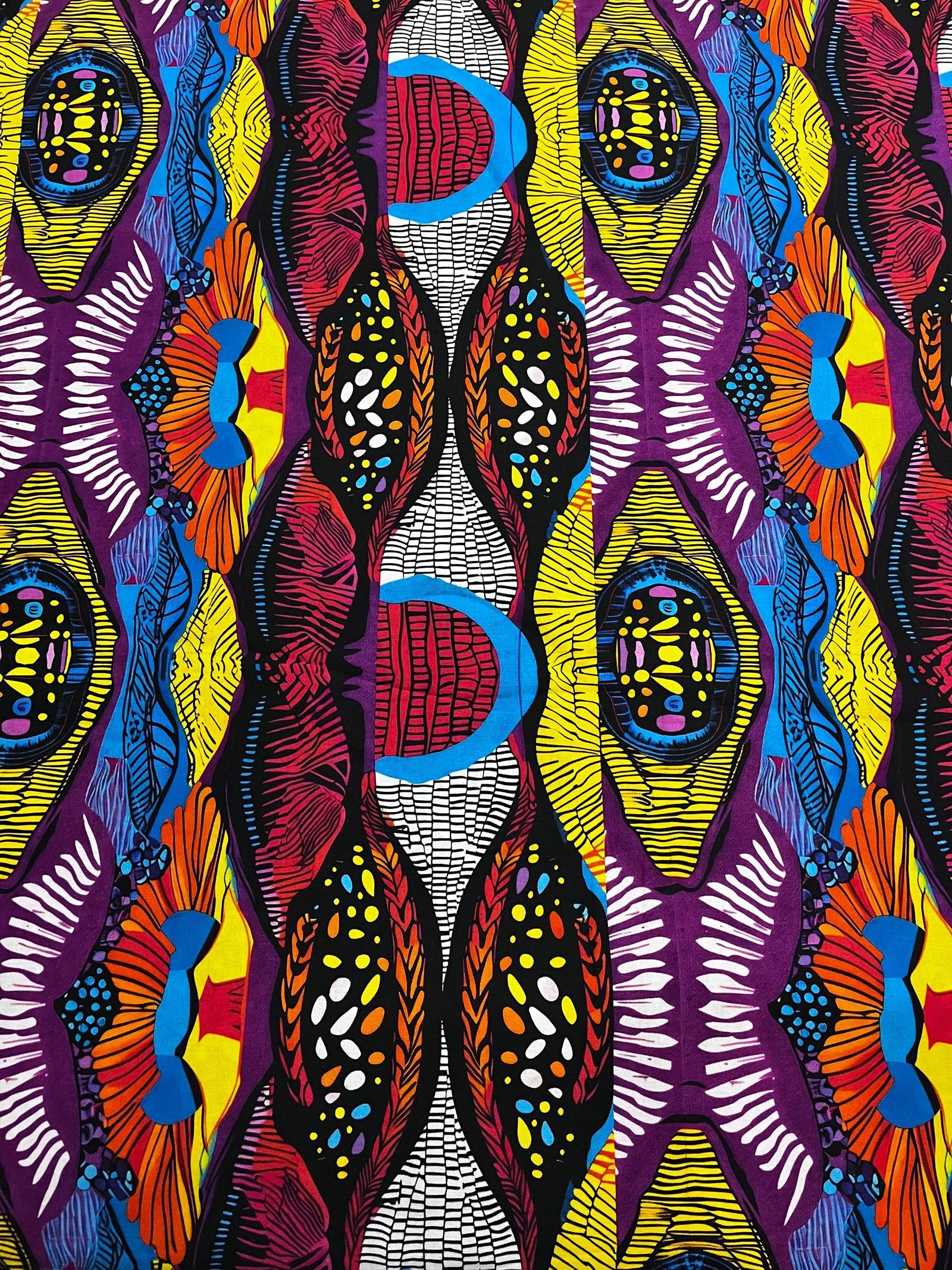 Bring vibrant movement and cultural artistry into your next project with Savannah Waves , a bold African print inspired by the flowing rhythms of the savannah. This striking design features wave-like tribal motifs, layered textures, dotted accents, and curved organic shapes that create powerful vertical motion. Rich tones of yellow, purple, red, blue, orange, black, and white combine into a visually stunning pattern perfect for standout creations. 100% Premium Cotton. Yardage Sold by the yard Continuous yards cut as one piece