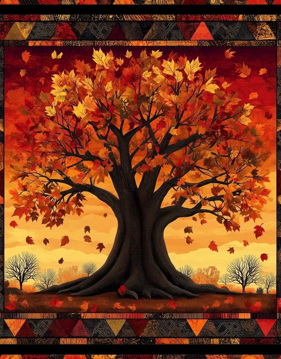 Tree of Life – 45″ x 36″ Cotton Panel Celebrate the beauty of nature with the Tree of Life cotton panel. This 45″ x 36″ design features a majestic tree surrounded by warm autumn leaves, printed on soft, high-quality cotton—perfect for quilts, wall hangings, and seasonal décor.